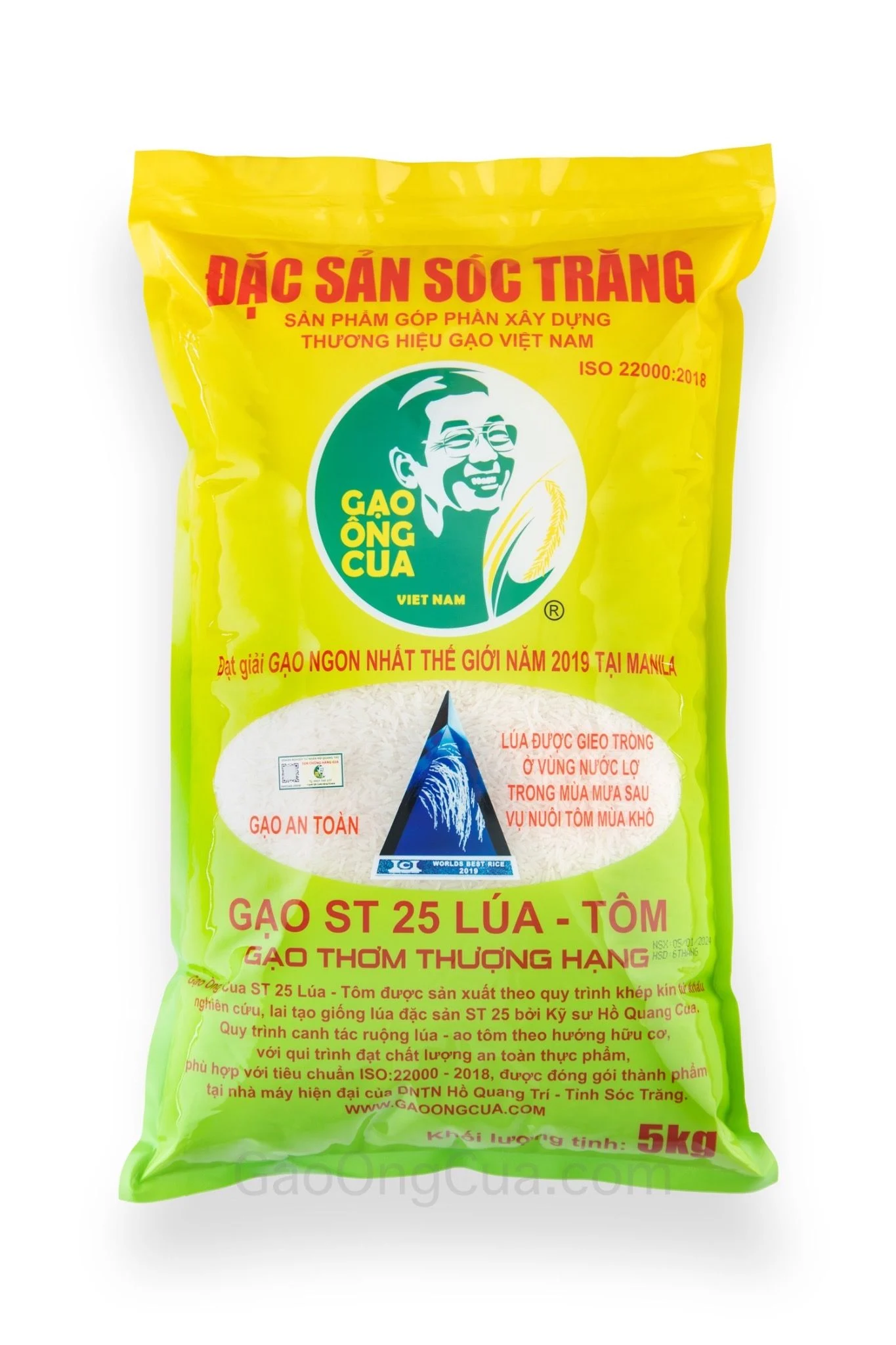 Gạo Ông Cua ST25 Lúa-Tôm "Gạo ngon nhất thế giới năm 2019 & 2023" được đóng túi 5kg, Một kiện hàng theo tiêu chuẩn nhà máy đóng gói có 5 sản phẩm tổng 25kg.